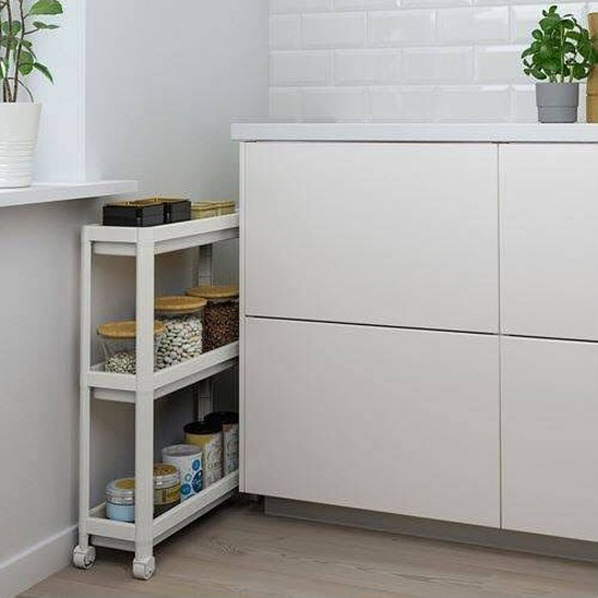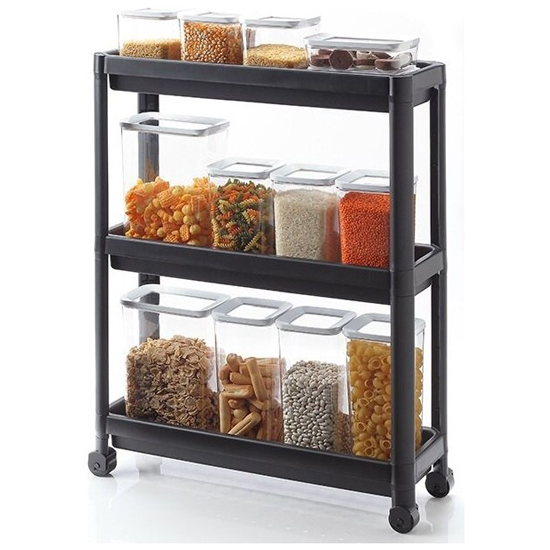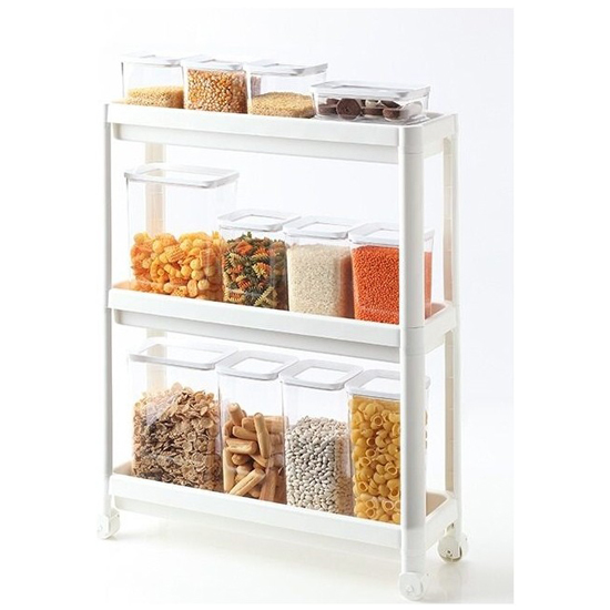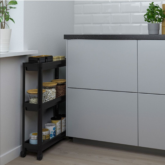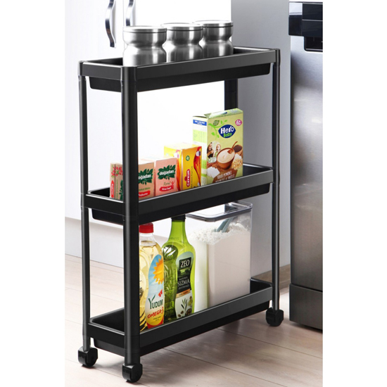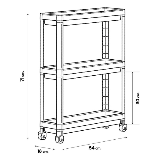 za kuhinju, izrađena od plastike, idealan je organizator za kupatilo, kuhinju ili balkon . Sa uskom i praktičnom 3-polnom konstrukcijom, Rail Polica sa Točkićima na 3 Nivoa za kuhinju, omogućava uredno skladištenje šampona, sredstava za čišćenje ili kuhinjski pribor, a njegov tačkasti dizajn olakšava pomjeranje.