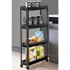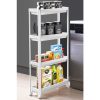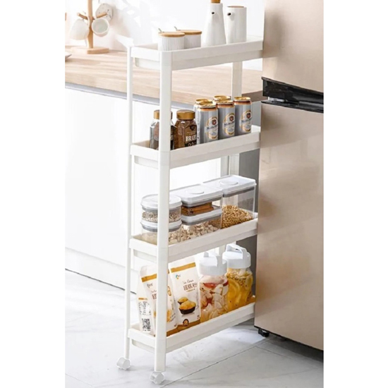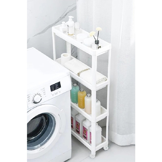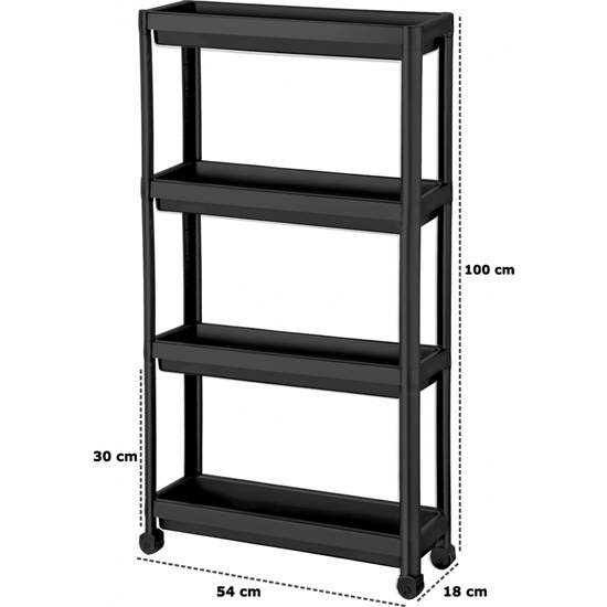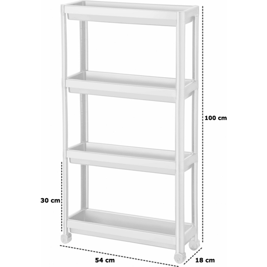 Rail Polica sa Točkićima na 4 Nivoa za kuhinju, izrađena od plastike i opremljena točkićima za jednostavno pomeranje i otpornost na vodu. Dimenzija joj je približno 100 cm visine, 54 cm širine i 18 cm dubine, što omogućava elegantno organizovanje deterdženata, začina i sredstava za čišćenje. Rail Polica sa Točkićima na 4 Nivoa za kuhinju, ne zahteva montažu i može se brzo postaviti u samo nekoliko minuta – idealno za male i uske prostore.
